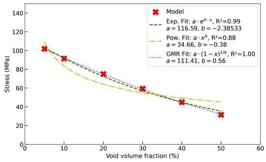 The dependence of elastic modulus on void volume fraction in the TRISO buffer layer was examined using three functional forms, as shown in Figure 9. The exponential relation, reproduced the dataset with but fails to enforce the physically required limit of as the void fraction approaches unity. The power-law expression, yielded a weaker fit () and is undefined at , making it unsuitable for describing the dense limit. By contrast, the GMR, also achieved an excellent correlation () while retaining a direct link to the remaining solid fraction . This formulation guarantees , ensuring physically meaningful end states. Moreover, the exponent reflects microstructural sensitivity; in this case . The explicit dependence on solid fraction and the ability to encode pore geometry make the GMR approach a more robust and interpretable description of modulus degradation than either the exponential or power-law forms. A similar analysis was performed on the strength of the TRISO buffer layer as a function of void volume fraction (see Figure 10). Although exponential and power-law relations reproduce the overall decrease in strength, their limitations are evident. The exponential fit () predicts an unrealistically steep drop at low porosity, while the power-law fit () underestimates the rapid loss of strength as void fraction increases. By contrast, the GMR formulation, with , , and , provides the most accurate and physically consistent description. It anchors strength directly to the remaining solid fraction (e.g., load-bearing capacity), ensuring and . The fitted exponent captures how pore geometry accelerates strength degradation beyond the rate of stiffness reduction.