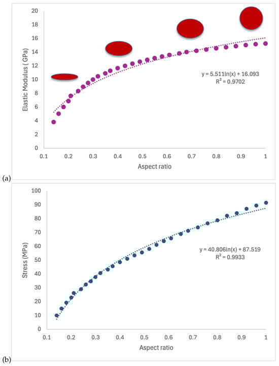 Figure 11a shows the dependence of elastic modulus on pore aspect ratio (AR, defined here as minor-to-major axis). Circular pores (AR = 1) preserve stiffness, whereas highly elongated pores (low AR, e.g., 0.1–0.2) markedly weaken the material. For AR ≲ 0.3 the modulus drops significantly, indicating a rapid loss of mechanical integrity in the presence of elongated porosity. The fitted moduli span ≈ 5–17 GPa and follow a logarithmic trend described by the equation with a goodness of fit of . Here, even at constant porosity, geometric anisotropy further degrades stiffness, highlighting the compounded mechanical impact of pore shape and volume fraction. The findings of our simulations show strong agreement with experimental observations reported in irradiation studies [15].