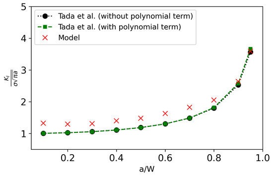 Comparison of stress intensity factor versus a/W ratio: Results from our numerical model show strong agreement with reference solutions from Tada et al. [40] both with and without polynomial correction, demonstrating the model’s accuracy in capturing fracture behavior.