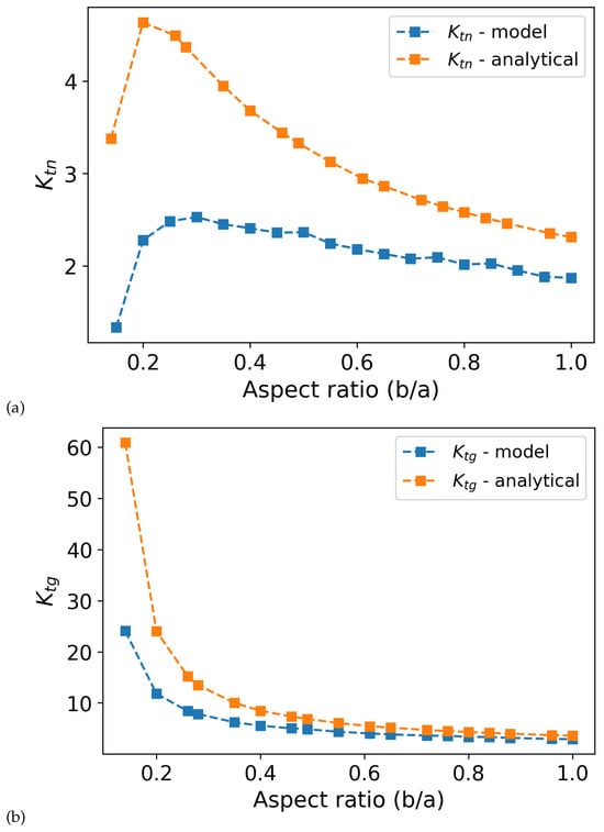 Comparison of analytical and numerical stress concentration factors ( and ) as a function of void aspect ratio (b/a), highlighting the influence of shape effects on stress amplification in the buffer layer, where (a) corresponds to and (b) to .