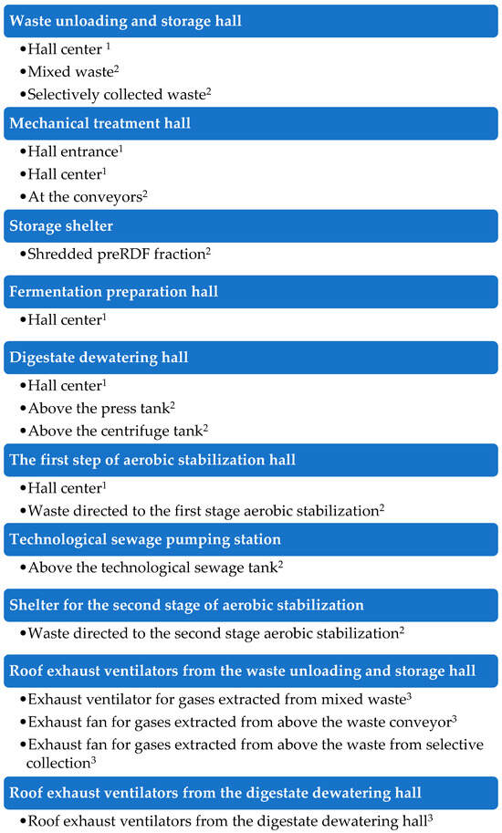 Based on the method of gas sampling, measurement points were assigned to three types of places: cubic source (sampling from the hall), surface source (sampling from under a static shield designed to minimize the impact of external factors), and sampling from the organized source with a fixed gas flow. Figure 1, Figure 2 and Figure 3 present the characteristics of the measurement points in individual biogas plants. The measurement points were selected on the basis of previously conducted pilot studies and represent individual components of the MWBP technological line.