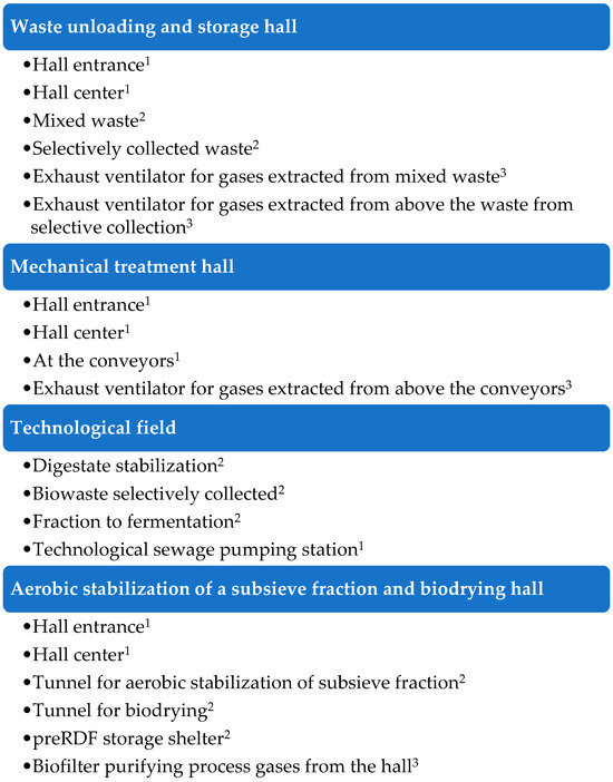This paper summarizes the results of comprehensive studies conducted at three MWBPs located in Poland. The studies were conducted annually to account for seasonality [40]. These studies include measurements related to concentrations of odor (cod) and odorants (concentrations of NH3, H2S, CH3SH, and VOC, as well as parameters related to the microclimate, such as air temperature (T) and relative air humidity (RH). Previous studies [25,41] presented the results of pilot studies conducted at six plants, forming the basis for the development of a more intensive research concept for the three selected plants.