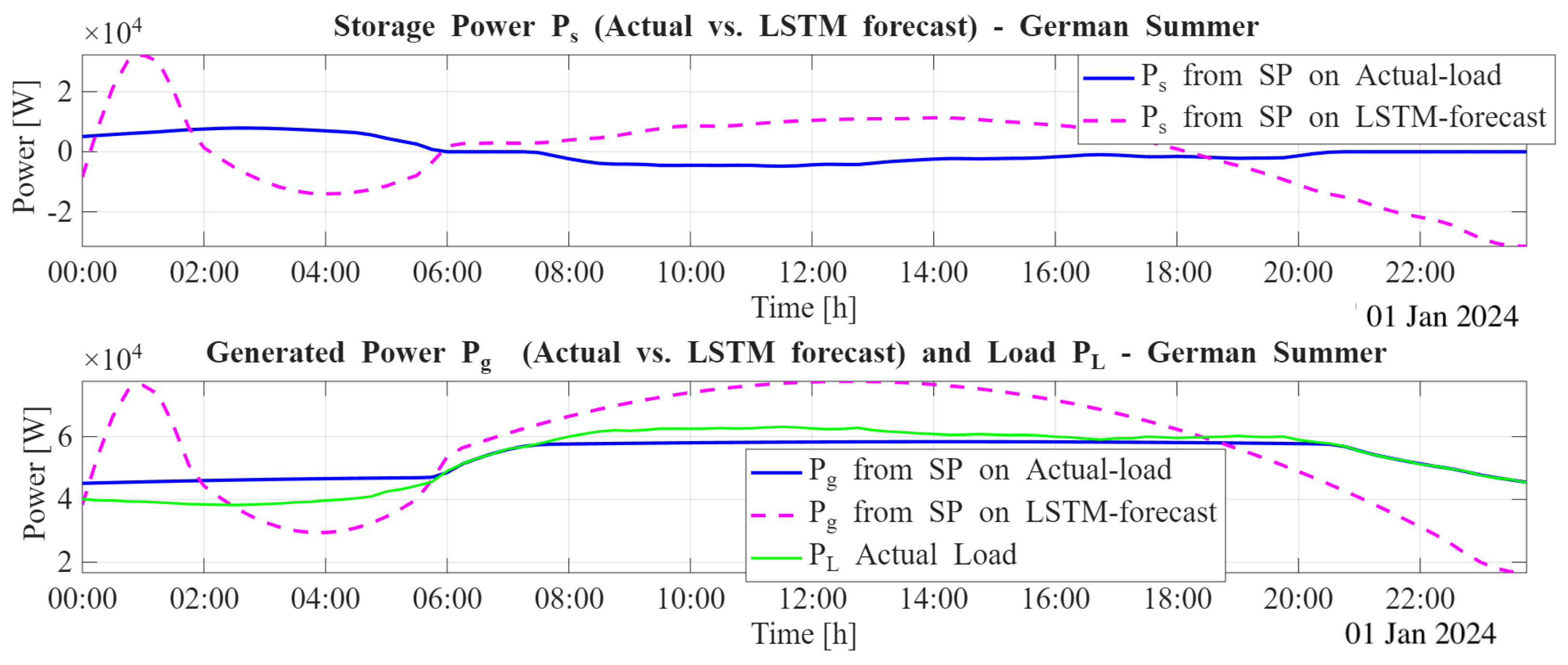 Figure 6 compares, for a representative German summer test day and a fixed storage capacity, the optimal generation trajectory obtained from the true load profile with those derived from the LSTM and ARMA forecasts. In each panel, the solid curve denotes the optimal generation
