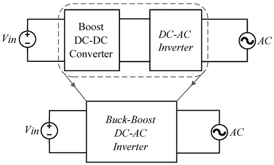 To achieve the buck–boost functionality, a boost converter is often cascaded to the conventional bridge-type inverter [8,9], as shown in Figure 1. In order to realize buck–boost functionality, the front stage DC–DC converter provides voltage boosting, while the VSI performs buck operation. Although the two-stage approach enables buck–boost operation, it suffers from reduced overall efficiency due to its multiple power conversion stages. Another disadvantage is the presence of the full-bridge inverter between source and load eliminating the common-ground possibility. As a result, common-mode voltage (CMV) and leakage currents can arise, even when a DC–DC converter shares a ground reference with the input source. To overcome these disadvantages of the conventional full-bridge inverter, improved designs like H6 [10] and HERIC [11,12] have been developed, with primary focus on leakage current reduction. However, these structures typically require additional switches and incur higher conduction losses, in addition to the front-stage DC–DC converter.