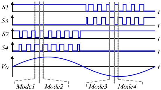 The proposed CG-BBI modulation strategy and the corresponding gate signal generation control block diagram are presented in Figure 3 and Figure 4, respectively. For the interval where the output voltage is positive , as shown in Figure 3, the switch is always ON, and is always OFF while the switches and are switching complementarily at high frequency. For the output voltage to be negative , as shown in Figure 3, the switch remains ON, and stays OFF while the switches and are switching complementarily at high frequency. CG-BBI has four modes of operation throughout a switching cycle. Modes 1 and 2 correspond to the positive half , whereas modes 3 and 4 correspond to the negative half .