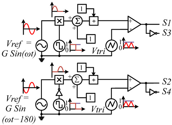 To generate a control signal , a reference signal = is multiplied with a rectangular signal of line frequency, having a duty cycle of 0.5 and an amplitude of 1. The resulting half-sinusoidal signal is then added to a constant value of 1. The reciprocal of the resulting DC-biased sinusoidal signal is compared to a 50 kHz triangular carrier (). Similarly, to obtain the gating signal of , the reference signal = is multiplied with the inverted rectangular signal of the line frequency, having a duty cycle of 0.5 and an amplitude of 1. The resulting half-sinusoid is then added to a constant of magnitude 1. Then the reciprocal of this DC-biased half-sinusoid is compared to the triangular carrier () with a 50 kHz switching frequency.