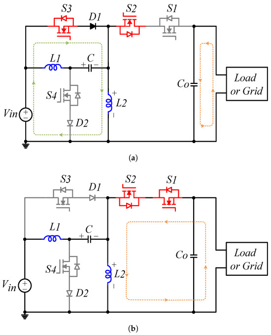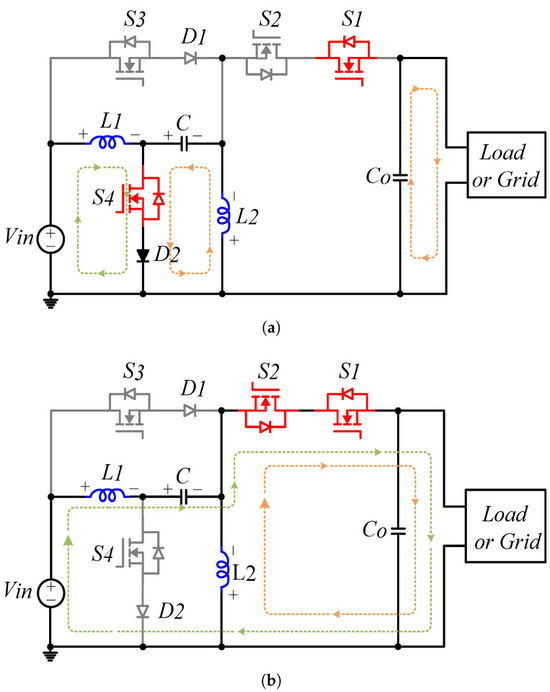 Mode 3: In this operating mode, and are ON, as shown in Figure 6a. Although is ON, no current flows through it due to the reverse-biased body diode of switch . During this interval, diode conducts, and inductor is energized by through switch and diode . The voltages on both the inductors and are