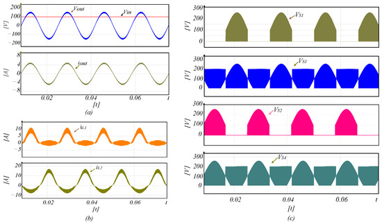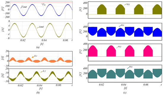 Figure 9a illustrates the input voltage , output voltage , and output current for the boost operation. It can be observed that, for an input voltage of 100 V, the output reaches a peak of V. The total harmonic distortion (THD) measured in boost mode for a load of 500 W is about and is acceptable according to the IEEE standard 519 . Figure 9b shows the current on both the inductors, and the ripples on both the inductors are less than of the peak inductor current. The switches voltage stresses are represented in Figure 9c. The switches experience voltage stresses, determined by the combined value of the input voltage and peak of the output voltage. Switches are subjected to almost double the input voltage.