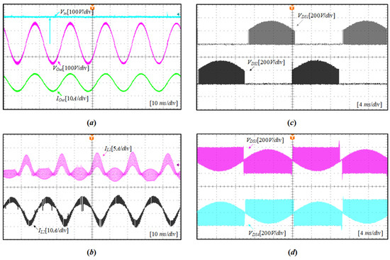 Experimental evaluation of the CG-BBI operating in boost mode: (a) input and output voltages with the output current; (b) current of inductors , ; (c) voltage stress on switches , ; (d) voltage stress on switches , .