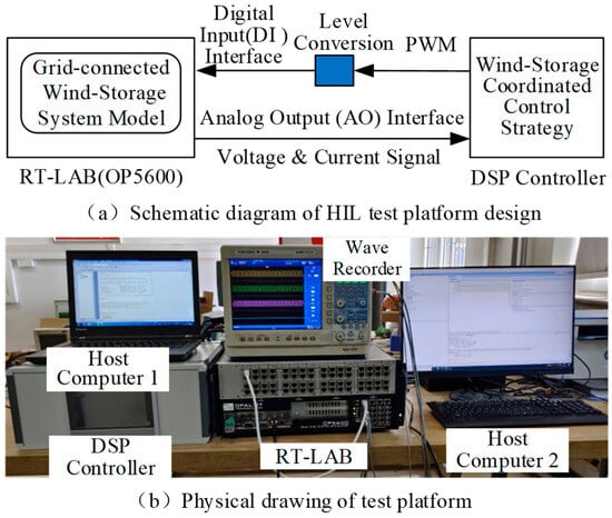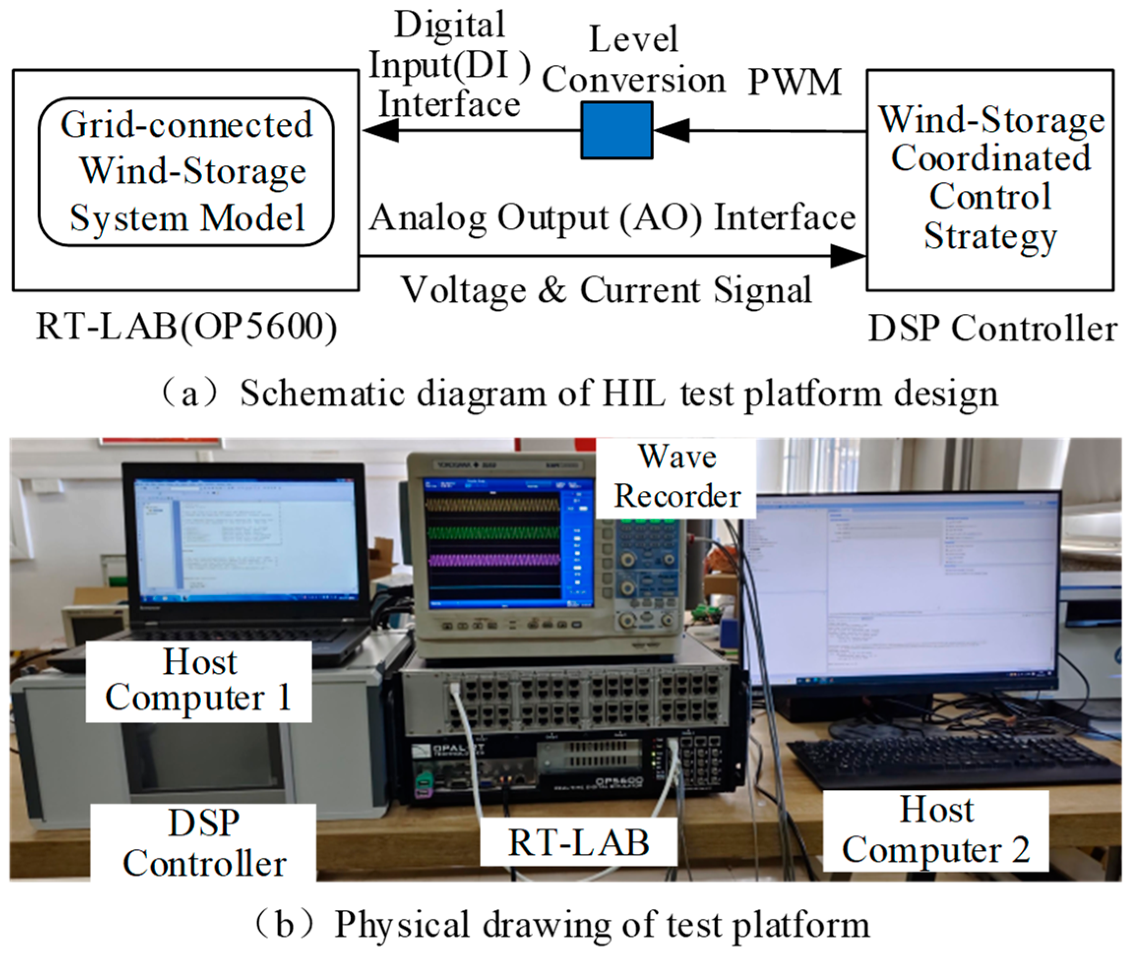 - Validation effectiveness of the strategy: This study established a HIL test environment based on RT-LAB OP5600 and completed verifications for working conditions such as deep LVRT, normal LVRT, and voltage fluctuations. The test results show that the proposed strategy can accurately match reactive power demands and effectively solve the problem of repeated LVRT caused by voltage fluctuations, which fully verifies the effectiveness of the wind–storage coordinated voltage ride-through control strategy and improves the wind farm’s adaptability to unconventional voltage events under extreme weather.