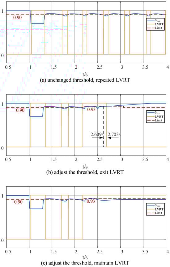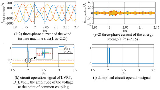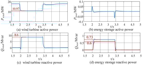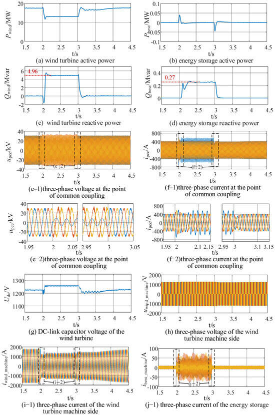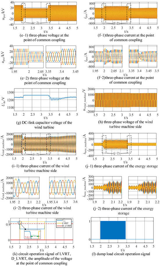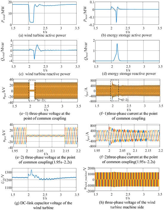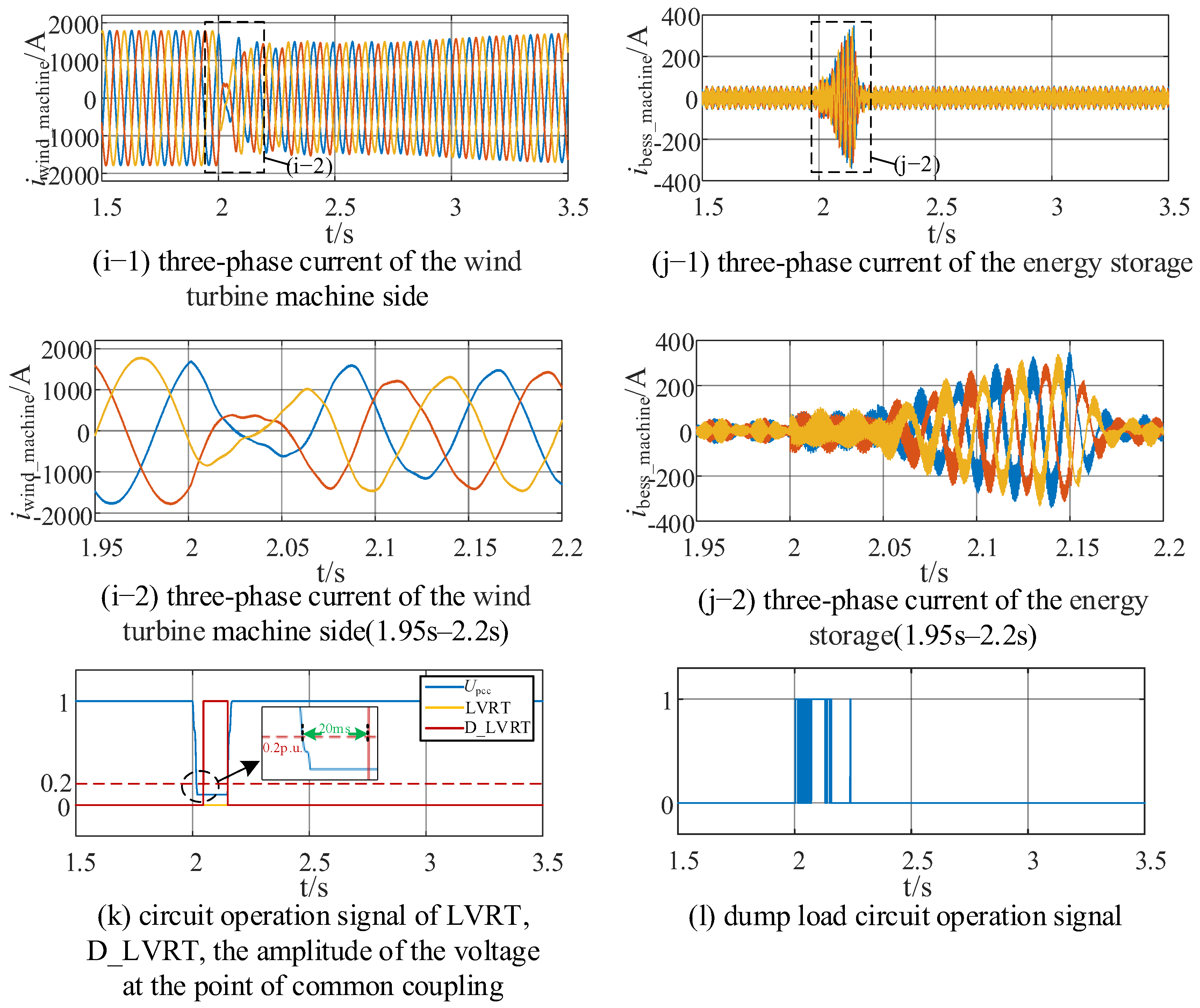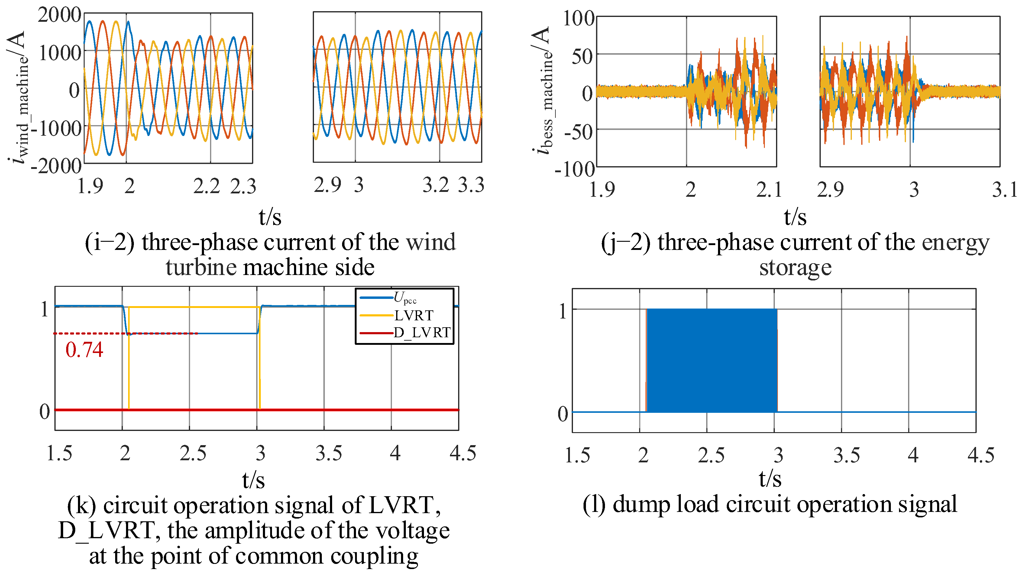 - This study classifies different operating modes based on voltage levels and designs an anti-fluctuation control logic. Compared with the traditional LVRT strategy, the multi-condition performance of the proposed strategy is significantly optimized. Under the extreme condition where the voltage drops to 0.1 pu, the traditional strategy will trigger wind turbine tripping, while the proposed strategy enables wind turbines to remain grid-connected and provide reactive power support. Under the condition of repeated voltage fluctuations induced by the coupling of weak power grids and active power fluctuations, the proposed strategy can suppress repeated LVRT within 2 s and avoid cyclic jumps of the system operating point along the PV curve. Under normal faults, the proposed strategy increases the reactive power support of the energy storage system from 0.6 Mvar (of the traditional strategy) to 0.733 Mvar, with an improvement rate of 22.2% under test conditions. This not only meets the requirements of China’s national standards but also avoids the problem of insufficient reactive power caused by the independent regulation of wind turbines and energy storage systems.