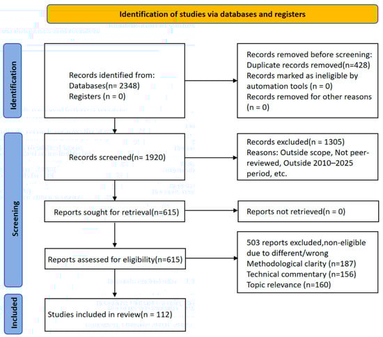 The process began with 2348 identified records. After removing duplicates, 1920 records underwent title and abstract screening, primarily excluding those outside the topical scope, not peer-reviewed, or published outside the primary time window of 2010–2025. Subsequently, 615 full-text articles were assessed for eligibility, with a focus on methodological clarity and direct relevance to the core themes of GEC mechanisms, credibility, and market-technology integration. This led to the exclusion of 503 reports, primarily for being technical commentaries, lacking methodological clarity, or lacking sufficient topic relevance. The final corpus for in-depth analysis comprised 112 studies. A particular emphasis was placed on literature from 2023–2025, as this period represents the most data-rich and coherent phase following China’s shift to full-volume certificate issuance, a phase marked by key regulatory updates and the rapid deployment of digital traceability technologies.