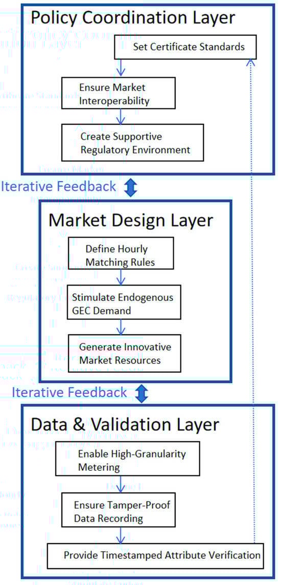 The framework comprises three mutually reinforcing layers: (1) a market-design layer governing certificate issuance, matching rules, and pricing signals; (2) a data and verification layer enabling real-time measurement, timestamping, and integrity assurance of renewable energy attributes; and (3) a policy coordination layer connecting the GEC system with other environmental markets such as the CET scheme. This layered structure clarifies the logical architecture of the framework and enhances its structural clarity.