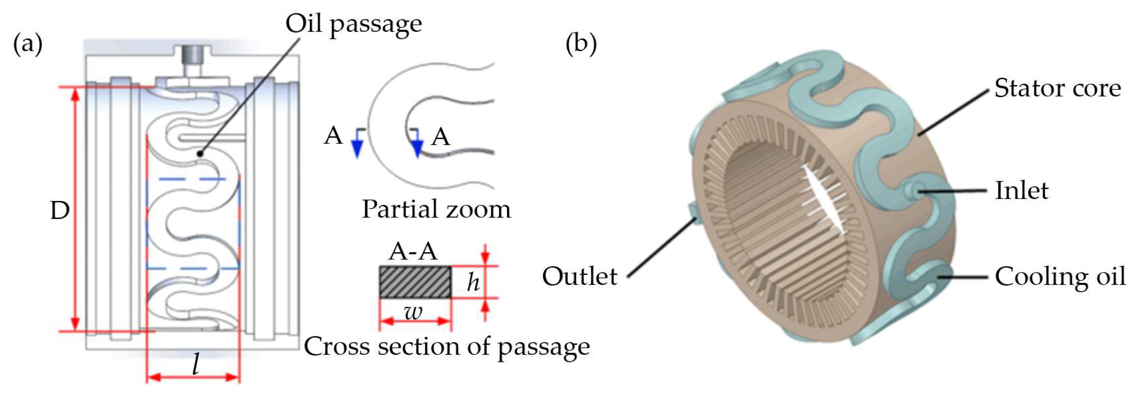 - Yang, C.; Wang, H.Z.; Niu, X.Z.; Zhang, J.; Yan, Y.G. Design and analysis of cycling oil cooling in driving motors for electric vehicle application. In Proceedings of the 2016 IEEE Vehicle Power and Propulsion Conference, Hangzhou, China, 17–20 October 2016. [Google Scholar] [CrossRef]