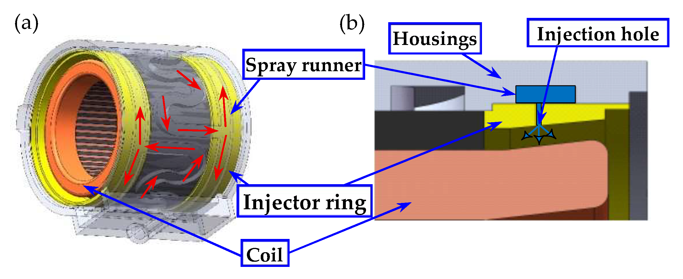 - Yang, H.; Wu, F.; Fu, J.; Zeng, J.; Fu, X.; Zhai, G.; Zhang, F. Study of the Thermal Performance of Oil-Cooled Electric Motor with Different Oil-Jet Ring Configurations. Energies 2025, 18, 4302. [Google Scholar] [CrossRef]