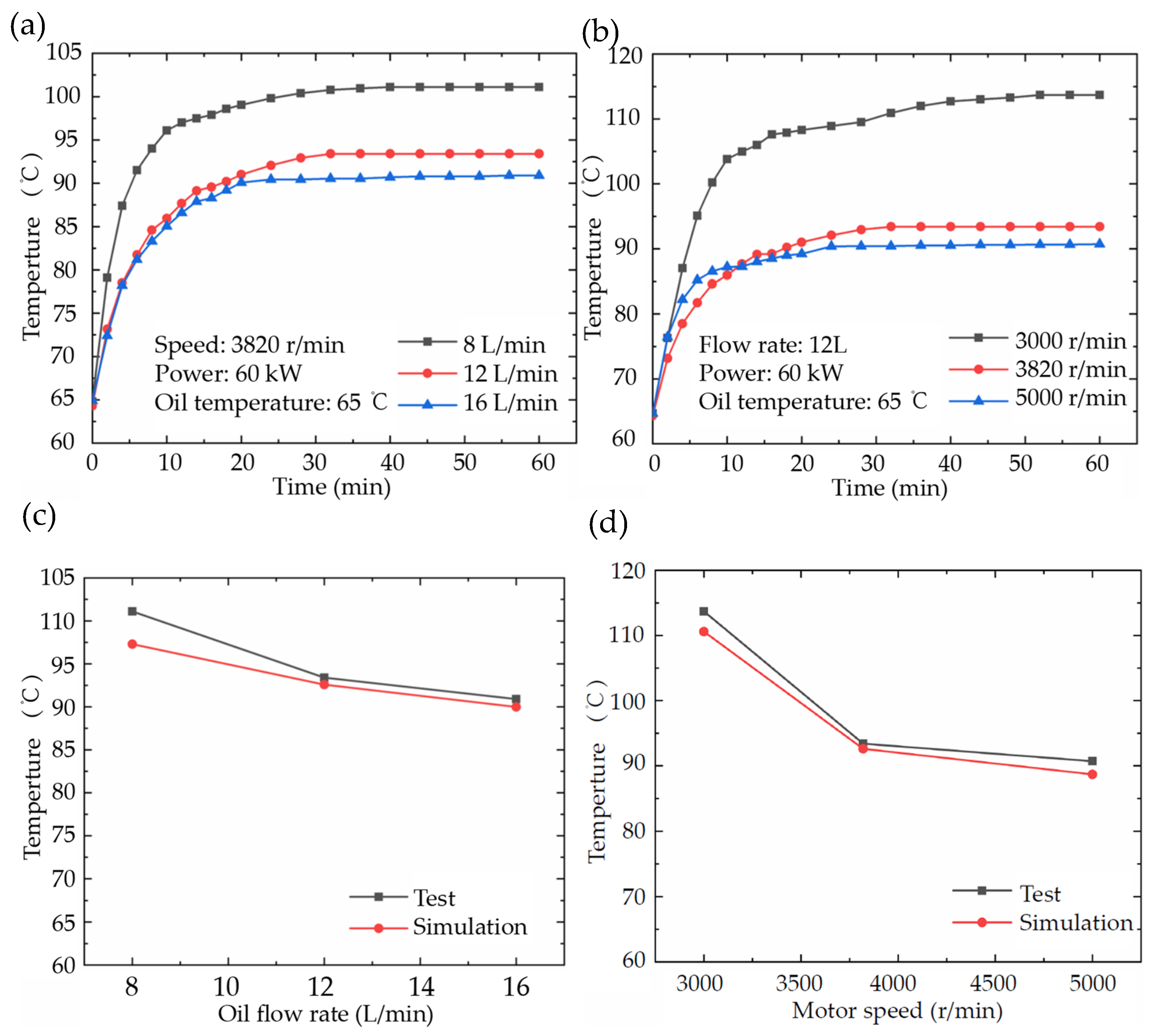 - The proposed combined oil-cooling scheme efficiently cools both the stator core and end winding and significantly improves the uniformity of motor temperature. At a cooling oil flow rate of 12 L/min, the maximum temperature of the end winding is 92.6 °C, only 1.5 °C higher than the maximum temperature of the stator core under rated operating conditions. The simulated end-winding temperature shows close agreement with the experimental measurements, with a maximum deviation of only 3.8 °C.