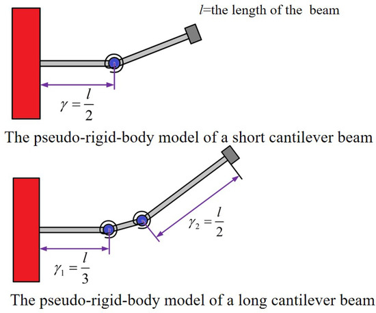 In Refs. [32,33], the small bending deformation of the cantilever beam is equivalent to the rotation of flexible revolute joints connected in series, which corresponds to the pseudo-rigid-body model. The deformation of a longer cantilever beam can be equivalent to the rotation of two serially connected revolute joints, which are located at one-half and one-third of the distance from the two ends of the beam. Meanwhile, the deformation of a shorter cantilever beam can be regarded as the rotation of a revolute joint located at its midpoint, as shown in Figure 2.