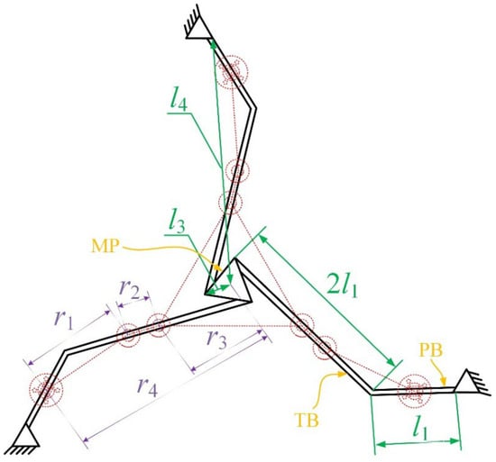 As indicated in Figure 3, l1, r3, and r4 can be regarded as independent variables, with all other structural dimensions being determinable therefrom. Specifically, l1 regulates the length of the PB, while r4 dictates the overall size of the C-MVEH. It is noteworthy that r3 merely denotes the size of the moving platform rather than that of the oscillator. The relationship between the dimensions of the 3-RRR compliant mechanism and those of its pseudo-rigid-body model can be obtained: