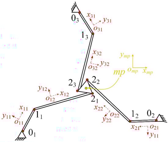 where s represents the sine operation; c represents the cosine operation; is the rotation angle of the ith rotation pair in the pseudo-rigid-body model, corresponding to the deformation of the PB in the ith branch; is the rotation angle of the moving platform; x and y are the displacement of the moving platform; and is constituted by the angles between symmetric branches.