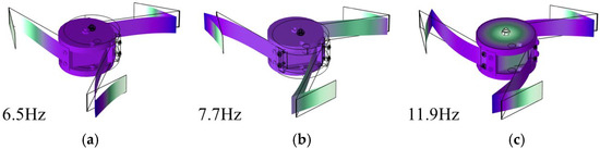 The first three natural frequencies and modes of the system obtained from simulation. (a) The first-order resonant mode and frequency, (b) the second-order resonant mode and frequency, (c) the third-order resonant mode and frequency.