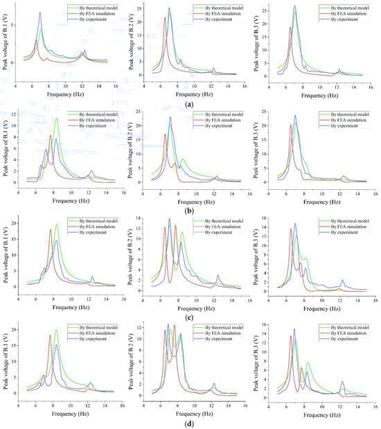 The curves of peak voltage with frequency under harmonic acceleration excitations of 0.2 g, 0.3 g, and 0.5 g are shown in Figure 9. It can be found that the peak voltages obtained from the theoretical model and FEA simulation show two wave crests, while the experimental data exhibit three wave crests. This is because the voltage near the first-order resonance peak is relatively small and does not stand out due to damping, which is consistent with the fact that the rotation angle of the R joint corresponding to the PB under the first-order modal shape is much smaller than that under the other two orders of modal shapes. Due to the neglect of the mass of the beam element and the idealization of the oscillator structure in the theoretical model, the resonance peak frequency is inconsistent with the simulation results, and the corresponding peak voltage is lower than in the simulation results. Due to machining and assembly errors in the developed physical prototype, the oscillator, flexible beam, and excitation direction do not lie in the plane where the C-MVEH is located. This results in some of the peak voltages obtained from the experiment being larger than in the theoretical and simulation results, which is particularly evident at the third-order resonance peak. For the overall result, the output voltage is approximately linearly related to the excitation acceleration, which indicates that the established model is correct.