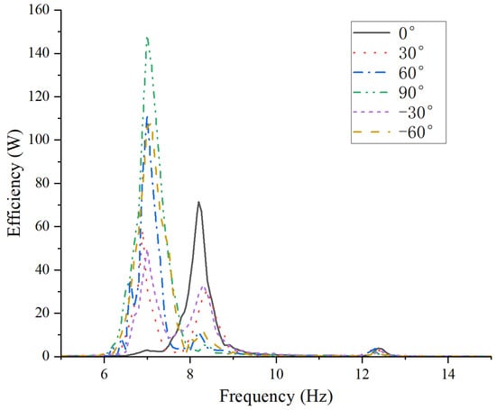 A connection frame between the physical prototype and the exciter is designed with rotation holes for adjusting the posture. An experimental study on the energy harvesting performance within the range of −90° to +60° around the center of the C-MVEH is conducted, and the results are shown in Figure 10.