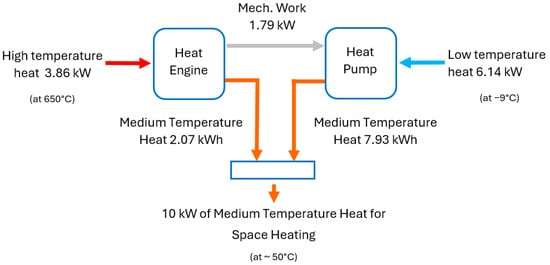 The heat pump extracts a total of X(CoP − 1) kWh of low-grade heat from the surroundings and delivers a total of (X∙CoP) kWh of low-grade heat at a temperature suitable for space heating. The total heat output from the combined system is (n − X) + (X∙CoP). Here, CoP is the coefficient of performance of the heat pump part, which is normally between 1 and 4, and n is a design variable of the heat engine part (related to its efficiency). To illustrate the concept, Figure 2 shows the heat and work flows in a unit with a 10 kW output. Section 3, Section 4, Section 5 and Section 6 discuss in detail how these values have been calculated.