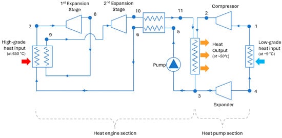 As mentioned, the mechanical work produced from the expansion of the working fluid in the two stages is used to drive the compressor of the heat pump (and the pump of the heat engine). A shaft (not shown in Figure 3) mechanically links the heat engine’s expander to the heat pump’s compressor. After emerging from the second expander, the fluid passes through a recuperator (10 → 11) where it preheats the low-temperature stream going to the high-grade heat collector (5 → 6).