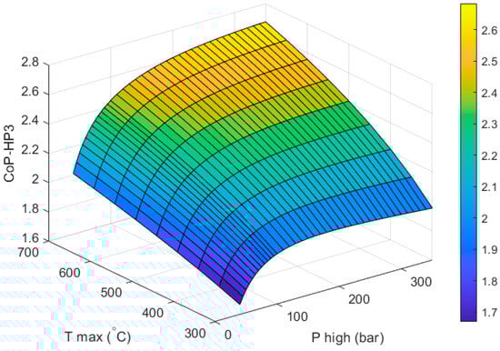 The heat engine part absorbs high-grade heat from the combustion of hydrogen (or another clean fuel) and drives the compressor of the heat pump. A parametric exploration of the heat engine was carried out based on two variables: and , representing the inlet pressure and temperature of the expansion train. The CoP of the full system (CoPHP3) increases as these two parameters increase because the heat engine produces more work per unit of heat consumed and there is less heat rejected at the condenser. In turn, this allows the heat pump to contribute more to the total heat output of the HP3 system, benefiting the overall CoPHP3.