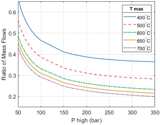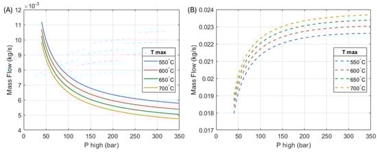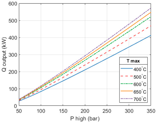 This section addresses the design of the heat engine subsystem of the HP3 system. A parametric exploration is carried out with two design variables: (1) the pressure of the working fluid at the high-grade heat collector () and (2) the temperature of the fluid at the outlet of the high-grade heat collector (). For , a range of values between 40–350 bar is evaluated. For , a range of 250 °C to 700 °C is considered. Several combinations between these two variables are assessed. Table 2 provides a summary of the assumptions made by the model.