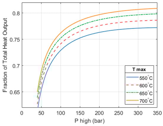 When no electricity is produced ( = 0), a CoPHP3 of 2.59 is achieved. This scenario has been discussed in previous sections and considers an ambient temperature of −9 °C, a of 650 °C and a of 250 bar. If the system is allowed to generate an additional 10% of its heat output in the form of electricity, the CoPHP3 will reduce to 1.975. If the electricity fraction () increases to 50%, then the CoPHP3 will drop to 1.2.