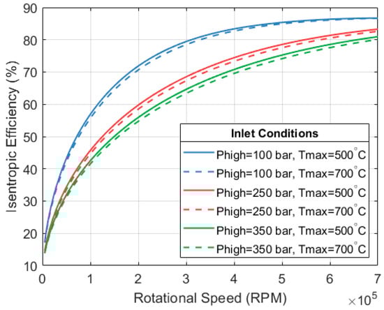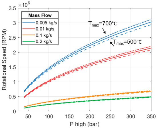 The paper presents a model to calculate expansion efficiency based on rotational speed and inlet conditions. A target expansion efficiency of 80% was defined and a limit of 170,000 RPM was set, which is comparable to the operating speeds of automotive turbochargers. A significant mass flow is required to achieve the target expansion efficiency with the rotational speed and inlet parameters (250 bar and 650 °C) specified. This leads to an overall heat output for the full HP3 system of 1.77 MW, enough to provide space heating to between 180 and 220 UK dwellings. Reducing the thermal output requires reducing the mass flow, which in turn requires increasing the rotational speed. For example, a 10 kW system would need rotational speeds higher than 1 × 106 RPM, far too high for a domestic-scale system.