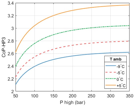CoPHP3 of an HP3 system with respect to its electricity output. Figure considers an ambient temperature of −9 °C, condensation temperature of 40 °C, = 650 °C and = 250 bar.