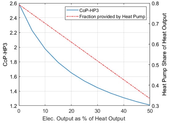 As previously mentioned, maximizing the contribution of the heat pump is desirable as it leads to a higher overall CoPHP3. Figure 20 also shows how the CoPHP3 of the full system decreases as the electricity output increases. In this case, the CoPHP3 of the full system is calculated as indicated by Equation (40).