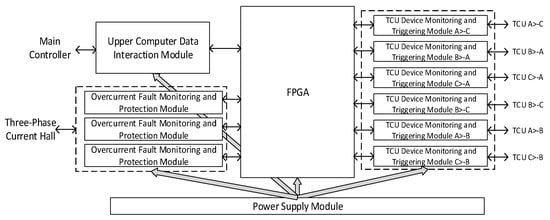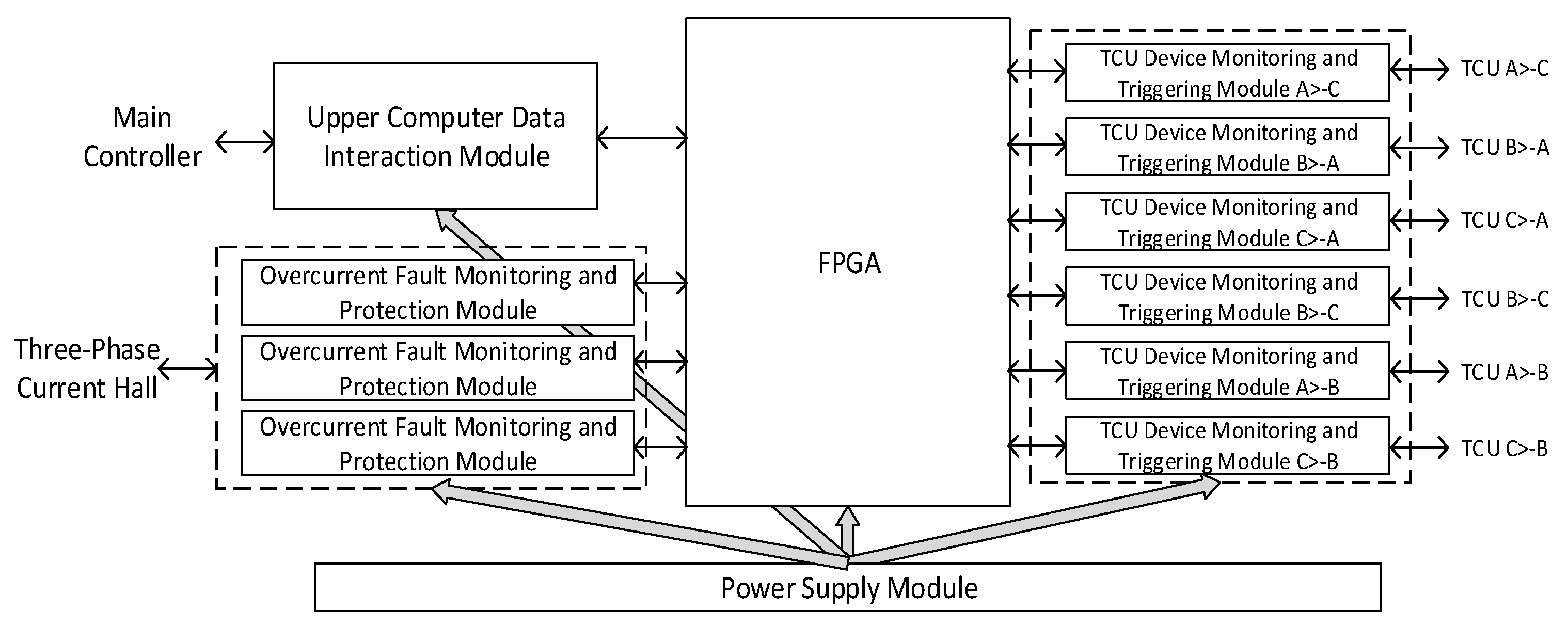 Figure 2, the system mainly consists of the upper computer data interaction module, overcurrent fault-monitoring and protection module, power supply module, FPGA, and TCU device-monitoring and triggering module. Among them, the upper computer data interaction module has three uplink 50 MHz optical communication channels, which are used to conduct information interaction with the main controller and also transmit the main control information to the FPGA inside the controller to achieve interaction between the two. The overcurrent fault-monitoring and protection module has three analog channel interfaces connected to three hall current sensors to measure the three-phase current in real time and to cause the sampling results to interact with the FPGA inside the controller; The function of the power module is to supply stable voltage and current to all other parts of the system. The TCU device-monitoring and triggering module has six pairs of downlink 5 MHz fiber control channels, each corresponding to three anti-parallel thyristor TCUs. It achieves real-time triggering control and status feedback of the TCUs based on established logic requirements and also interacts with the FPGA.