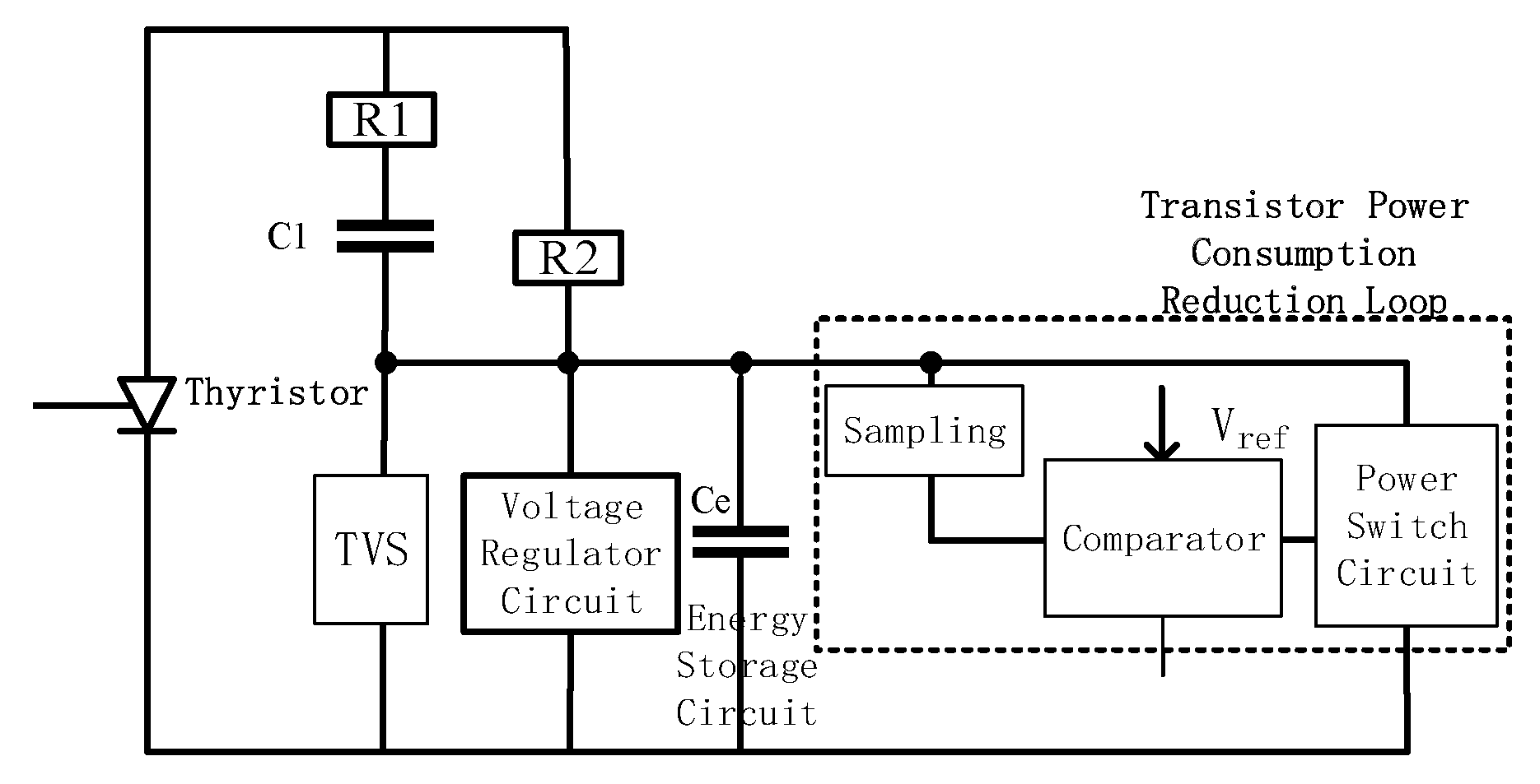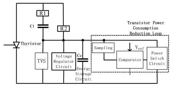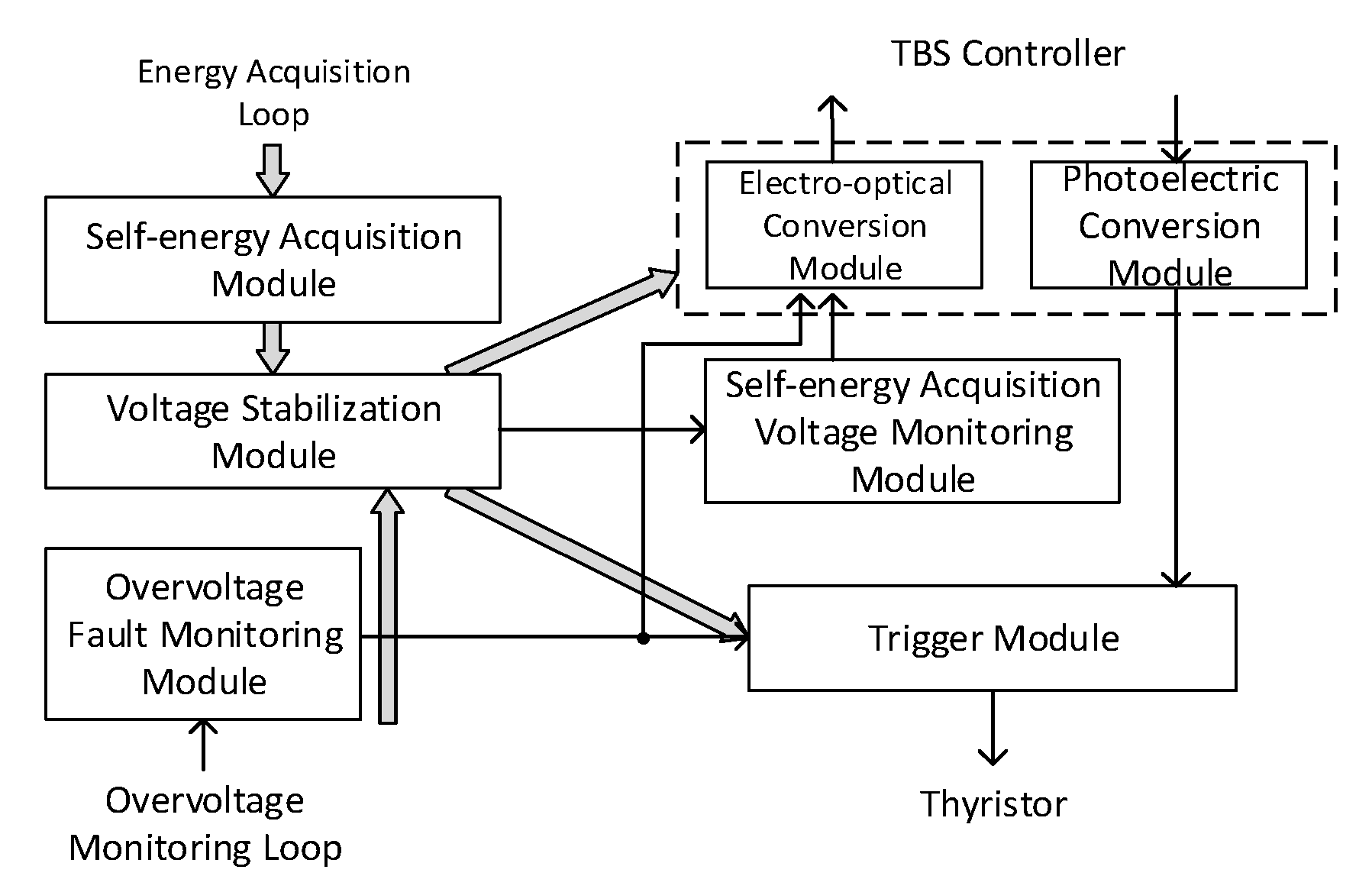 Figure 3, which covers the self-energy-harvesting module, voltage stabilization module, self-energy-harvesting voltage-monitoring module, overvoltage fault-monitoring module, electro-optic/photoelectric conversion module, and trigger module. The self-harvesting module achieves wideband wide-voltage harvesting by combining with an external energy-harvesting RC circuit. The voltage regulator is responsible for stabilizing the voltage output by the self-powered module, and after the voltage regulator operation is completed, it supplies power to the other logic modules and trigger modules. The main function of the self-powered voltage-monitoring module is to monitor the power voltage and, through the electro-optical conversion module, transmit the current power status information of the TCU to the D-TBS. The overvoltage fault-monitoring module monitors the secondary voltage of the D-UPFC series transformer through the thyristor voltage equalization circuit and makes an overvoltage judgment, and then transmits the judgment result through the electro-optical conversion module to the D-TBS and the TCU trigger module. The trigger module receives the trigger command through the photoelectric conversion module and then triggers the thyristor.