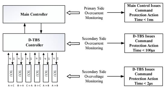 Figure 6. The architecture consists of three layers: the main controller layer, the D-TBS controller layer, and the TCU layer. Signal transmission and trigger control are achieved between these layers through an optical fiber communication network. At the main controller layer, the system collects the primary side current signal of the D-UPFC series transformer in real time, with a protection response time of no more than 1 ms. The D-TBS controller layer is responsible for monitoring the secondary current parameters of the D-UPFC series transformer, and the protection action delay is controlled to within 100 μs. The TCU layer works in conjunction with the D-TBS controller layer to monitor the voltage on the secondary side of the D-UPFC series transformer in real time, with a protection execution time of less than 2 μs. The protection system uses fiber optic communication technology, which not only significantly enhances anti-electromagnetic interference performance but also enables reliable transmission over long distances, providing convenience for the layout and control of field equipment.
