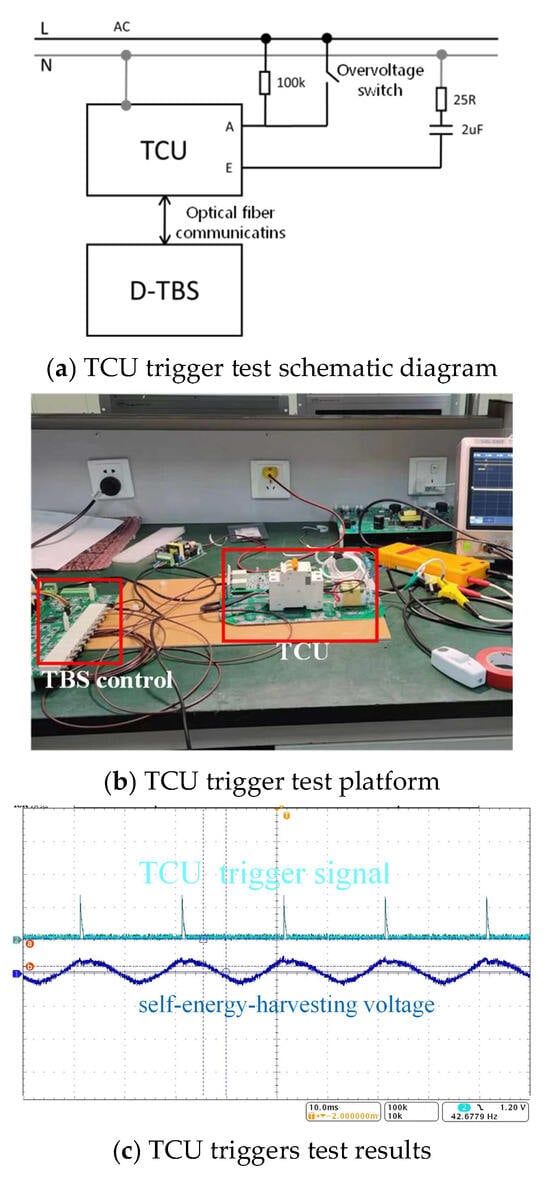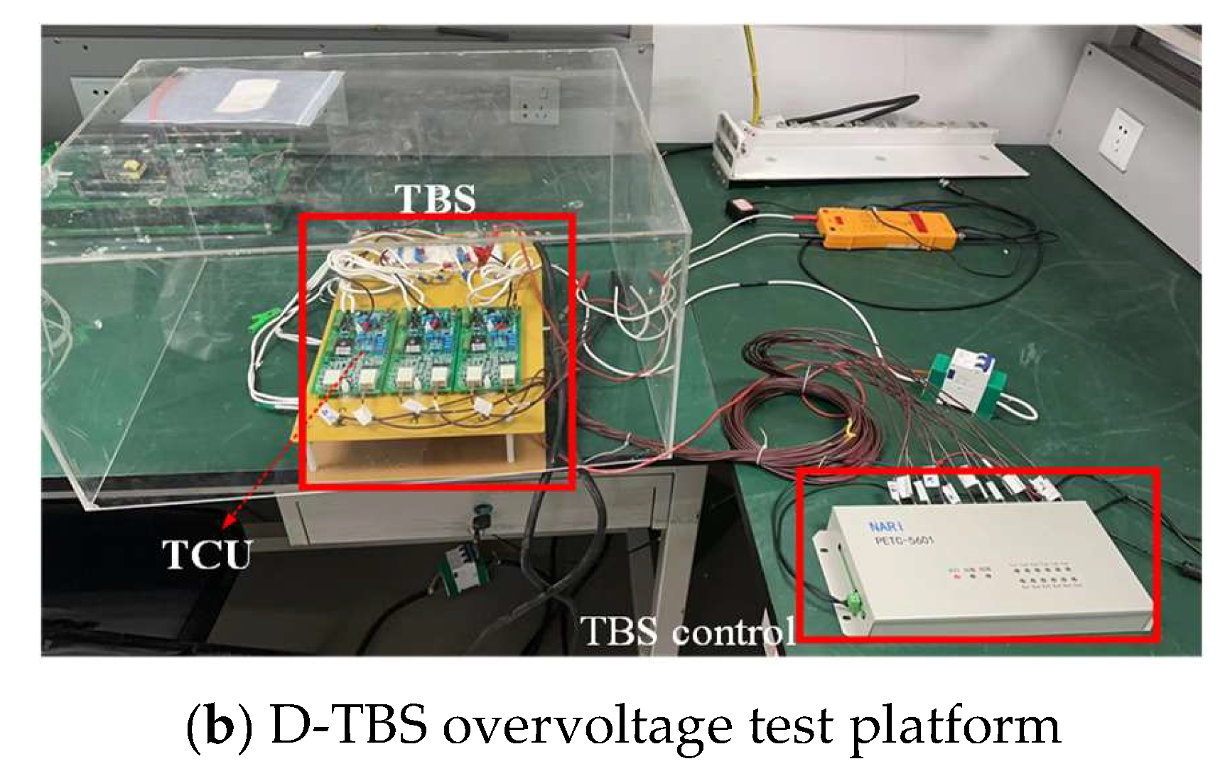 In the hierarchical architecture of the protection system, the TCU monitoring unit serves as the primary protection mechanism, with optimal response characteristics. It works as follows: When the current in the RC energy-harvesting loop is in the positive half-cycle, the self-harvesting module of the TCU initiates energy harvesting. During the forward alternating period of the voltage signal, the voltage monitoring unit of the TCU detects the forward voltage signal and immediately sends a pulse signal to the D-TBS through the electro-optical conversion unit. At the same time, the overvoltage-monitoring unit collects the voltage parameters of the thyristor voltage-equalizing resistor loop in real time and compares them with the preset overvoltage protection threshold. When it detects that the sampled voltage exceeds the threshold voltage, the overvoltage monitoring unit simultaneously performs two operations: On the one hand, it transmits a pulse signal to the D-TBS through the electro-optical conversion unit, and on the other hand, it sends a trigger command to the trigger unit, thereby driving the thyristor into the conduction state.