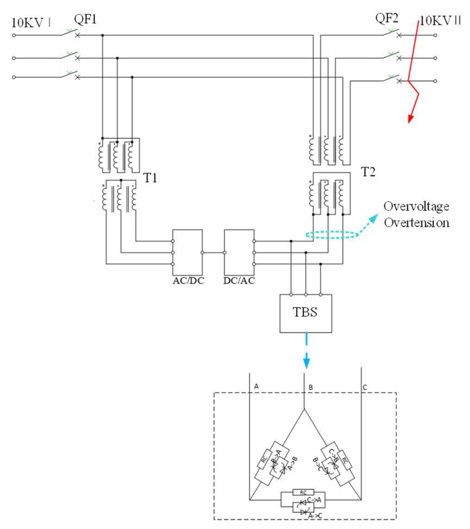 Figure 1 shows the topology of a medium-voltage flexible interconnect system based on a D-UPFC. This set of the flexible system includes the parallel transformer T1, the series transformer T2 and the low-voltage converter, which are connected to the 10 kV line to achieve flexible interconnection between the two transformer areas. The output end of the low-voltage converter is connected to the high-voltage AC system via the series transformer. When a short-circuit fault occurs in the high-voltage system, the system short-circuit current is conducted to the low-voltage side through the coupling effect of the transformer, thereby causing severe overvoltage and overcurrent conditions on the low-voltage side. In view of this, protective measures must be taken for the converter to prevent it from being damaged.
