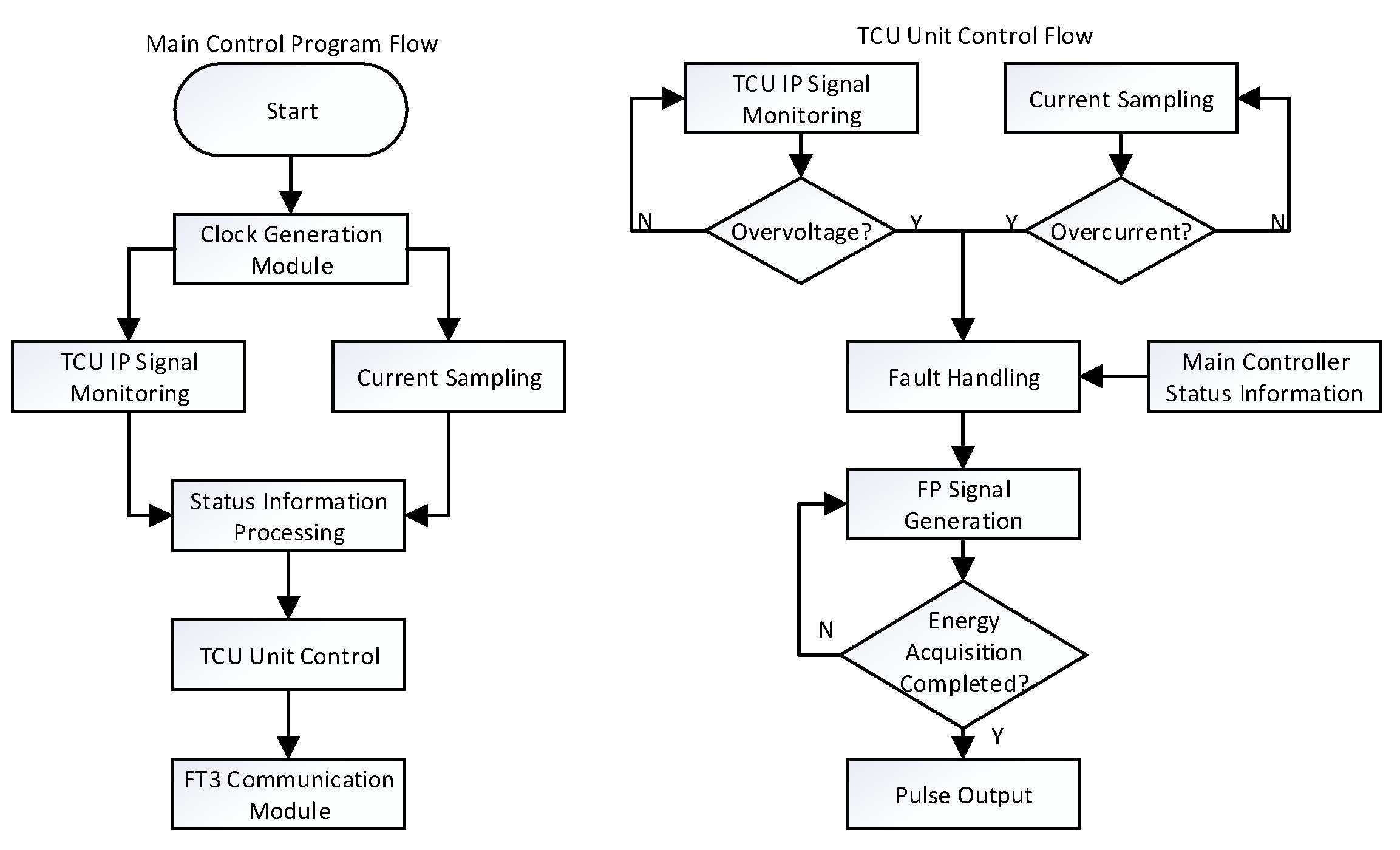 When the D-TBS control unit detects overvoltage in a specific TCU module, the system will perform a fault-marking operation and simultaneously activate the trigger mechanism of the remaining TCU modules, thereby achieving rapid bypass protection for the main equipment. The implementation process of the protection logic is as follows: The FPGA processor first parses and judges the IP signal feedback from the TCU. When the first valid IP signal is captured, the system confirms that the TCU module has completed external energy harvesting and entered the normal working state, and then initiates the overvoltage monitoring program. If a second valid IP signal is detected during the monitoring cycle, an overvoltage fault is determined and the system marks the fault and sends an FP trigger instruction to the other TCU modules. Due to the adoption of an optical triggering method for controlling the TCU module by the D-TBS control unit, mis-operations of the TCU caused by external interference are essentially eliminated. Furthermore, during operation, the D-TBS control unit periodically reports its status to the main controller. This enables the system to promptly detect internal faults within the D-TBS control unit and execute predefined countermeasures. In addition, when the D-TBS control unit fails to receive a valid IP feedback signal from a certain TCU module for five consecutive power frequency cycles, it will be determined that the TCU module has failed. The system will perform the fault marking and notify the main control unit to initiate the equipment disconnection operation. The specific process is illustrated on the right side of