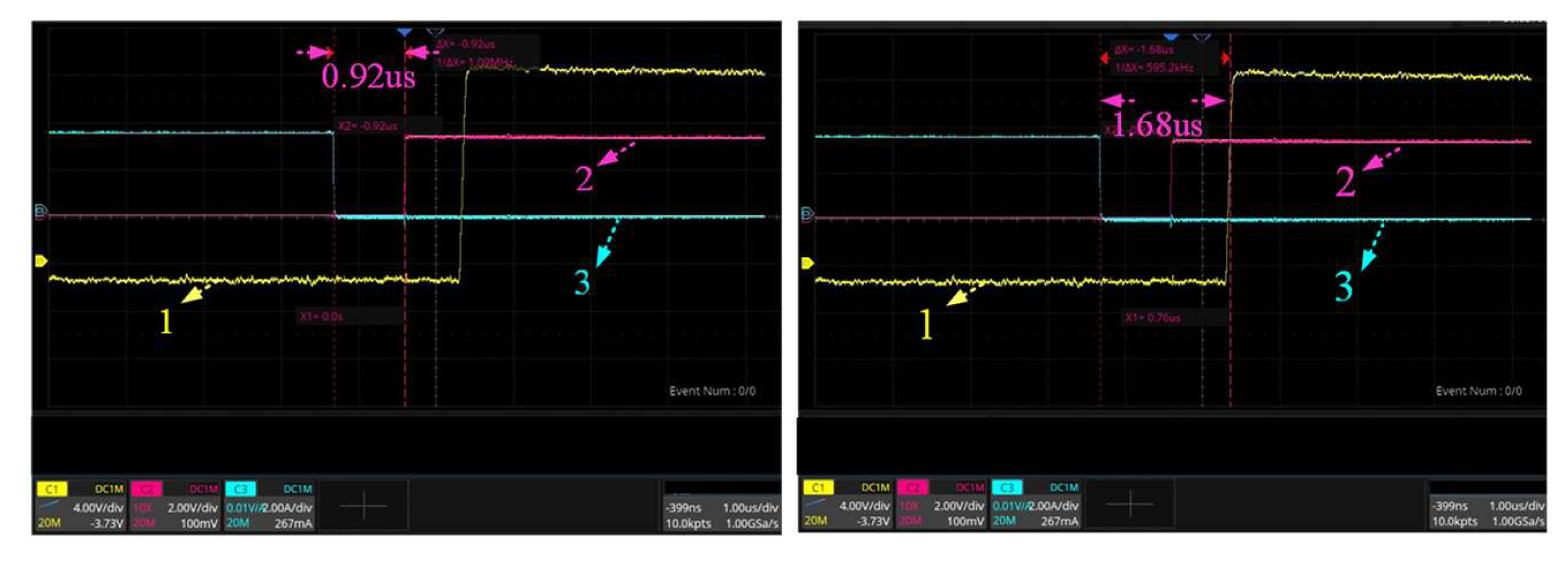 Figure 12, line 1 represents the overvoltage fault signal (low effective) received by the D-TBS, and line 2 is the unlock signal output by the D-TBS controller in response to the fault, with a delay of 920 ns measured by the oscilloscope (of which 800 ns is the filter delay). Line 3 is the output of the TCU thyristor unlock signal, with a total delay of 1.08 μs. The device’s extremely fast response speed ensures effective protection can be achieved during the initial stage of a voltage surge, significantly reducing the risk of damage to power components. The design functionality meets the intended requirements.