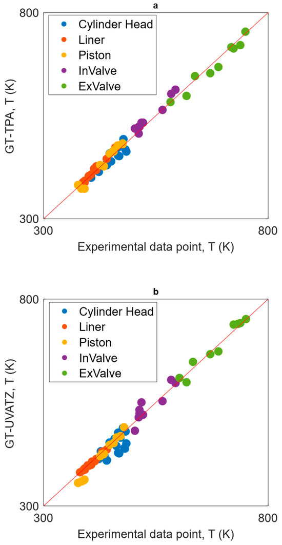 Figure 5 presents two subplots, corresponding to the successive steps of the calibration process. Figure 5a shows wall temperature calibration results, assuming direct experimental burn rates imposed as the combustion object via three pressure analysis (TPA). A total of 81 points were plotted, corresponding to three validation cases—Case B, Case C, and Case F—representing an engine load sweep from 21% to 83% (Table 2). Figure 5 compiles 27 results for each operating point. These represent the individual measurement locations illustrated in Figure 5: 10 for the cylinder head, 6 for the liner, 5 for the piston crown, and 3 for each of the representative exhaust and intake valves. Figure 5b compiles the same set of results, but in this case, combustion was predicted by the UVATZ code rather than being directly imposed.