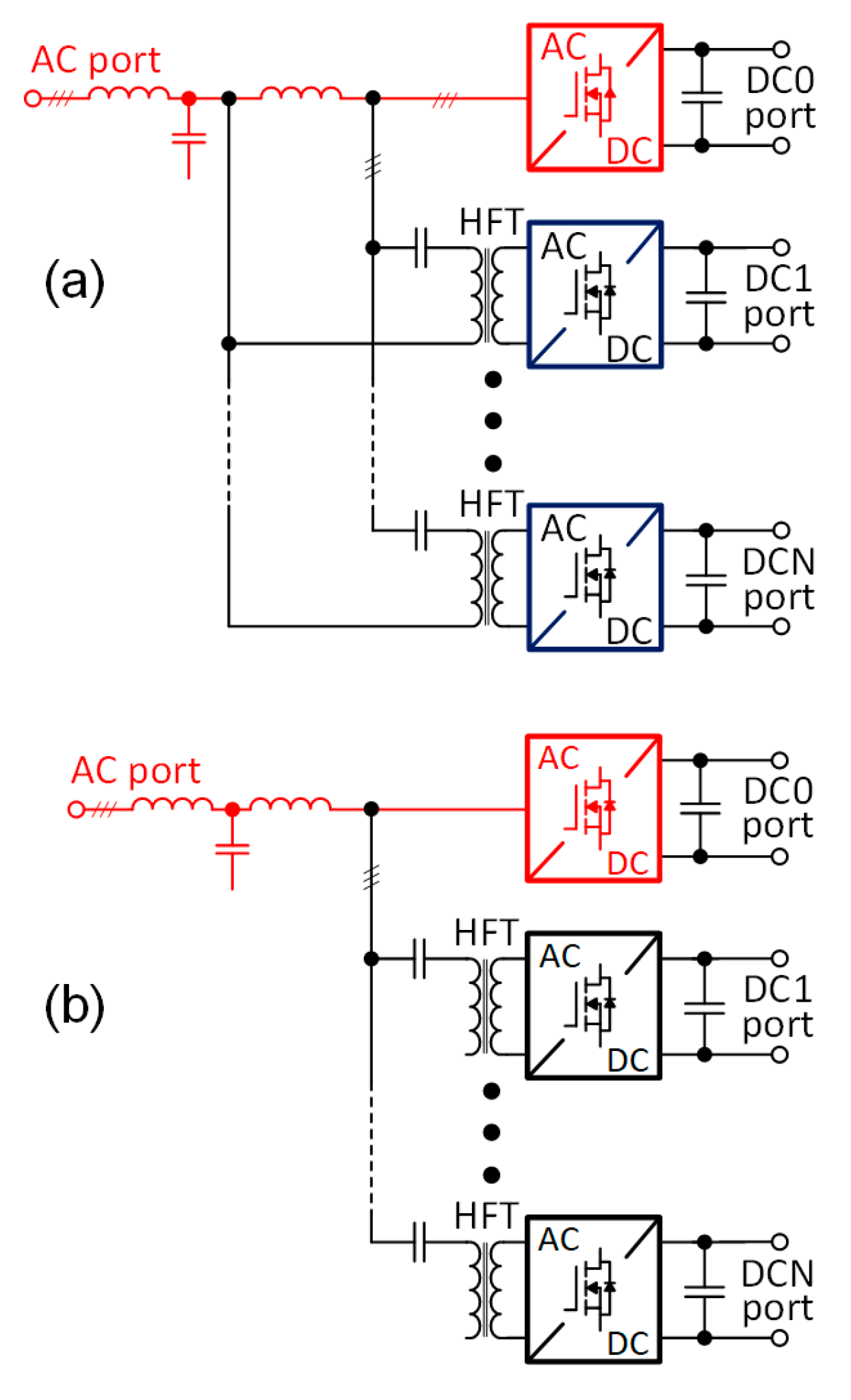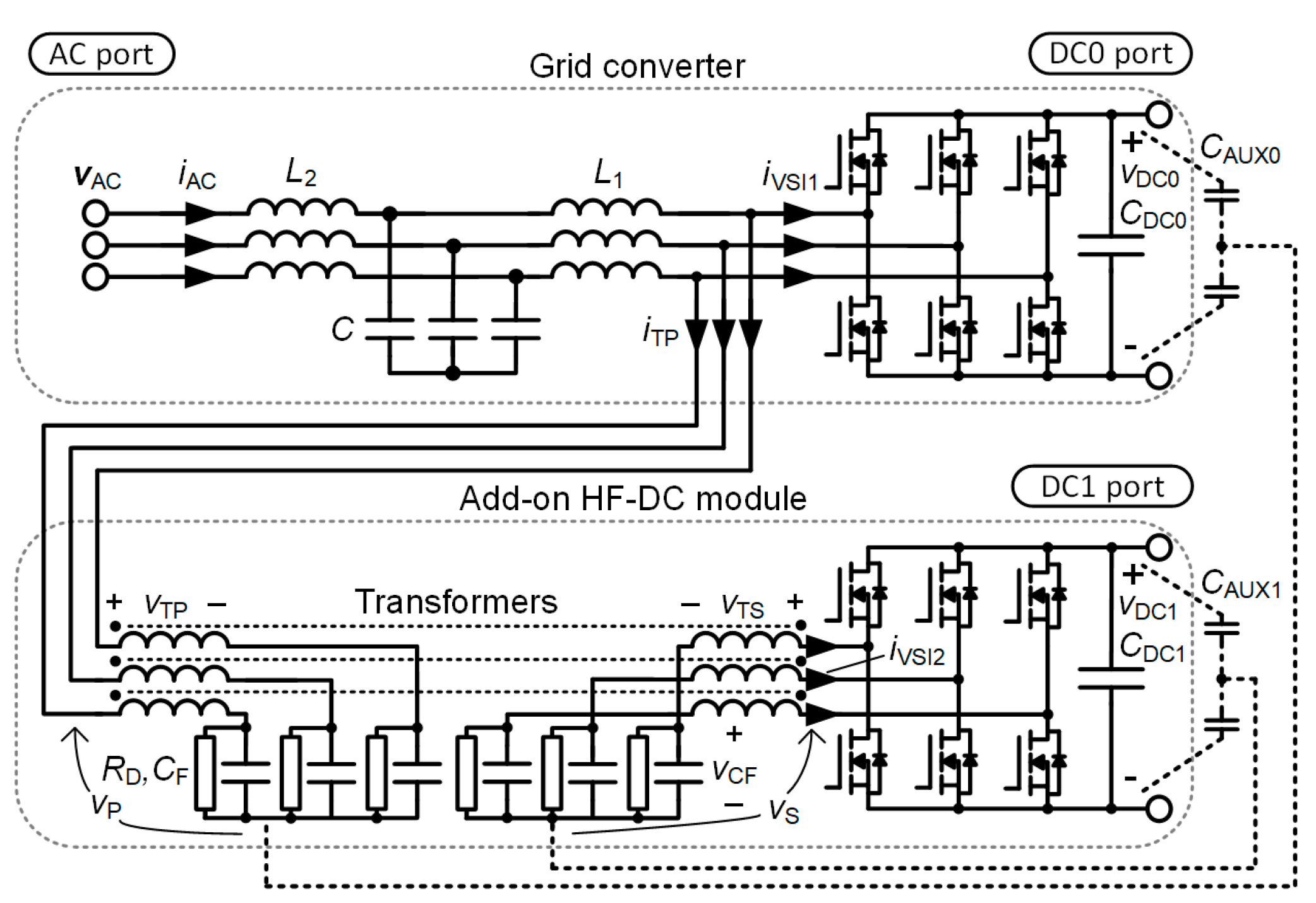 Figure 3, modified in this way, would enable the coupling of two DC ports and two AC ports. In general, any additional HF-DC module can be used to separate two additional ports, one DC and one AC. However, the frequency of the LF component for each AC port may vary, as power transfer occurs mainly at the carrier frequency, as shown in the spectra in
