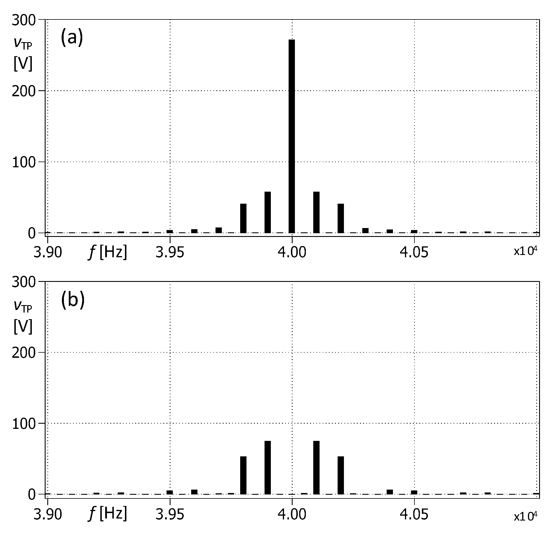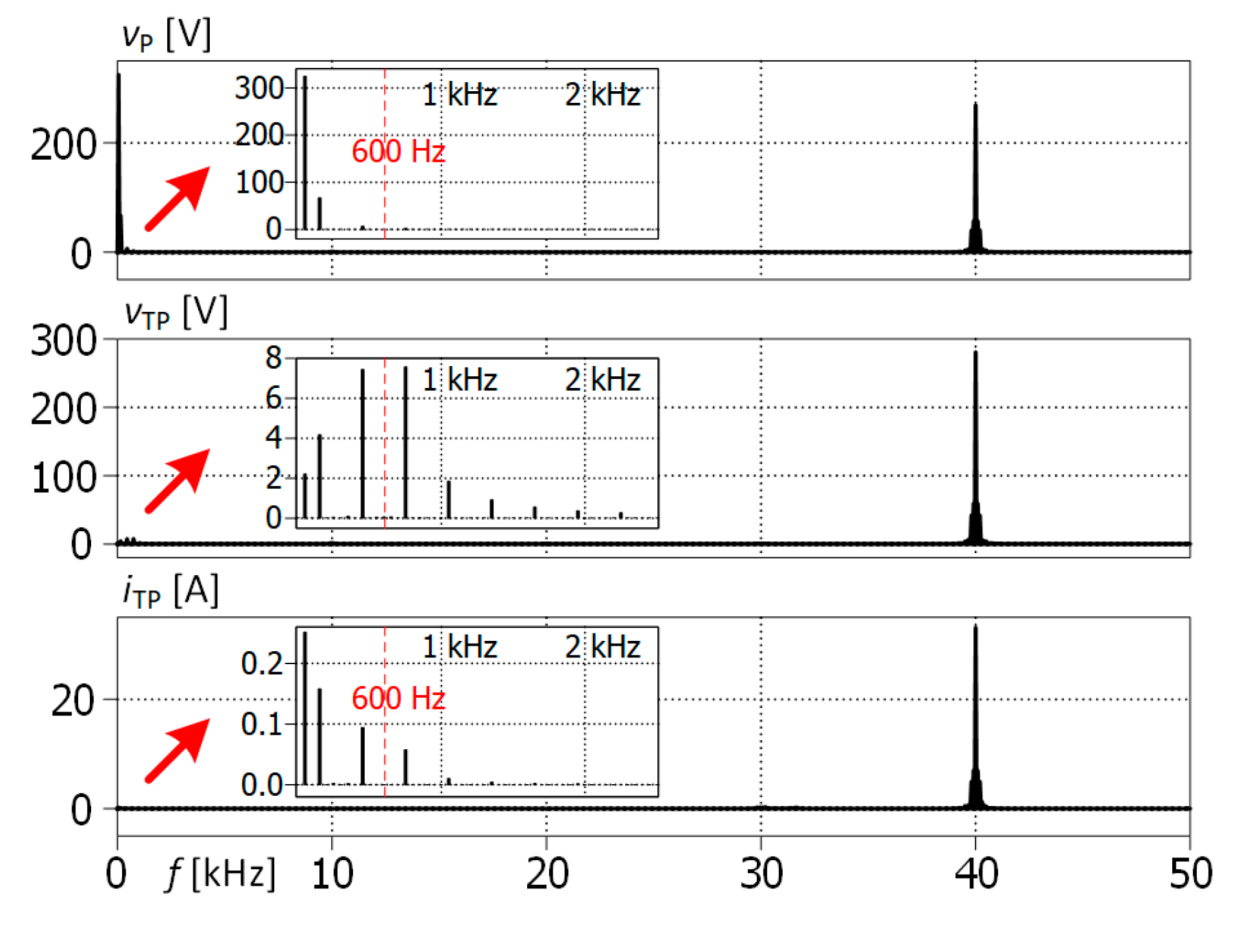 Figure 13). The amplitude of the 50 Hz LF voltage component of the transformer winding is equal to 2 V. The dominant LF voltage harmonics are around 600 Hz, which is equal to the lower resonance frequency defined by (10) and passively damped by the