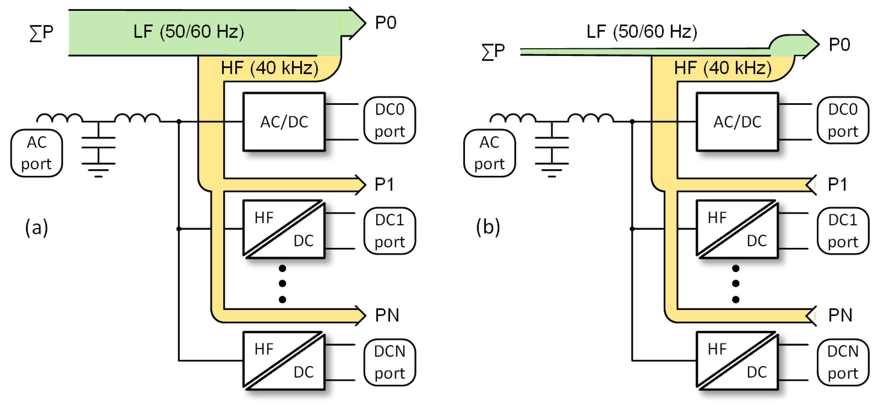 Figure 5a depicts the case of energy transfer from the AC port to all DC ports, neglecting losses, whereas the diagram in