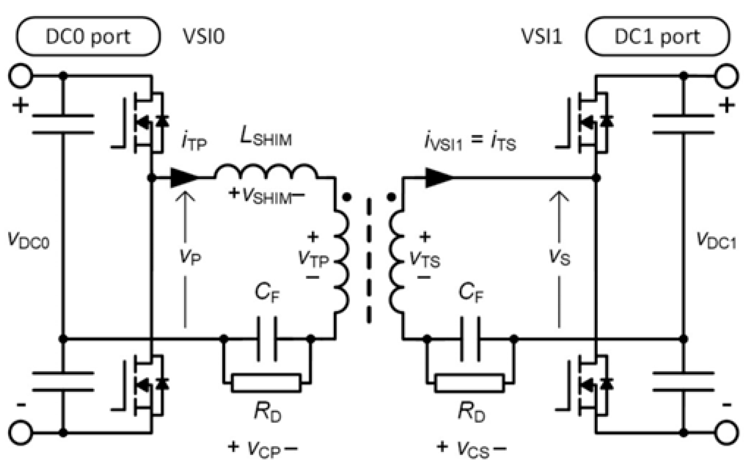 The particular transformers are connected to the appropriate VSI legs in half-bridge topologies on both sides. The DAM converter constitutes a symmetrical, three-phase circuit. The connections of the HF transformers’ star points with the corresponding VSI midpoints, denoted in