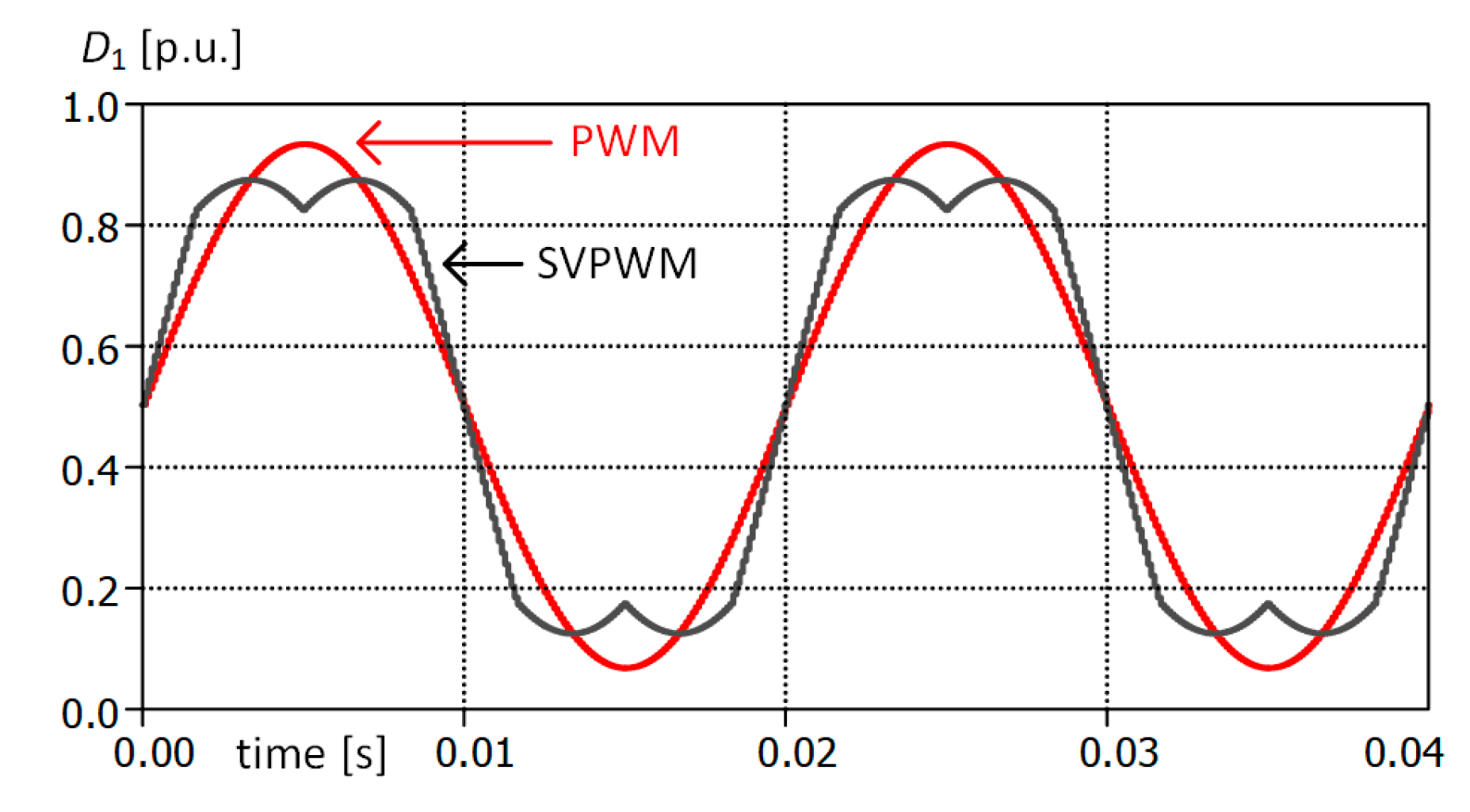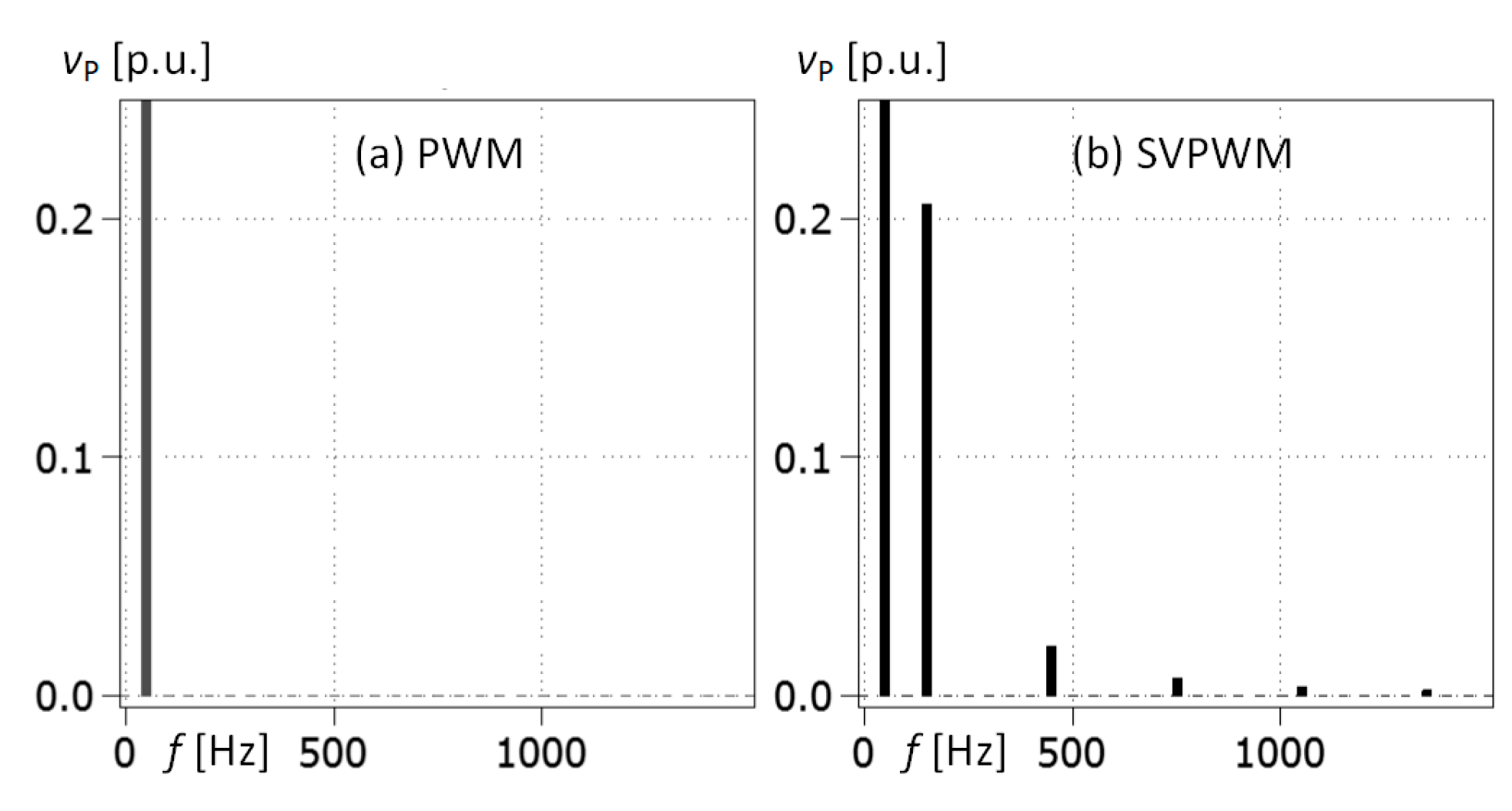 Figure 13. For an SVPWM-controlled grid converter, the 50 Hz voltage component is reduced from 325 V to about 2 V. For a PWM-controlled grid converter, there are no low-frequency voltage components above the fundamental (50/60 Hz).