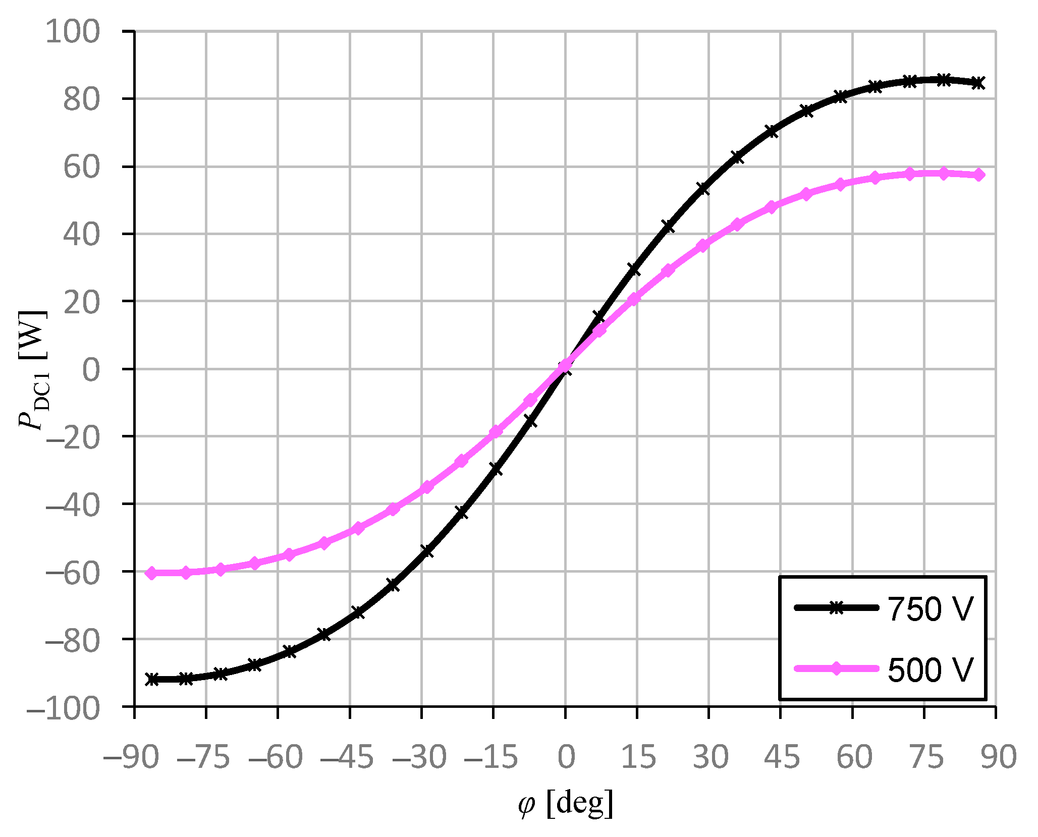 PDC1,NOM must be limited to about 20 degrees in order to limit the circulating non-active transformer current component. The DAM converter control characteristics for two DC1 voltages of the output port (for the minimum value and the value equal to