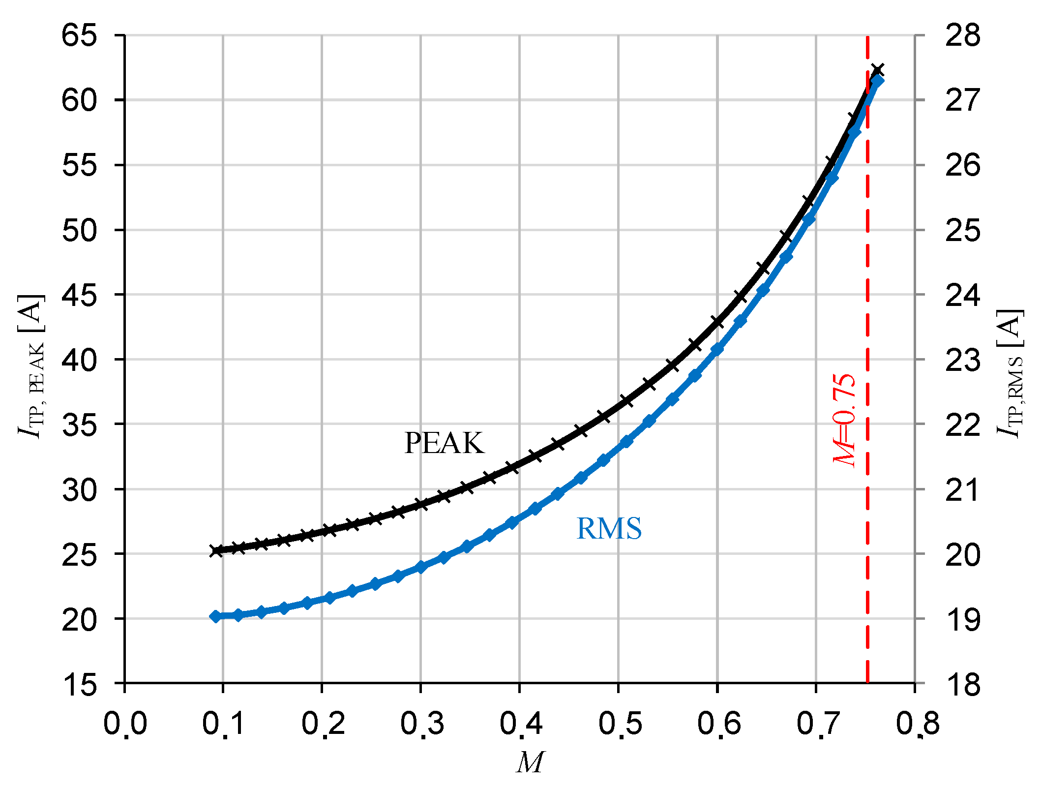 M = 0.75, is marked with a red dashed line. This point corresponds to 230 V of supply voltage and 750 V at port DC0.