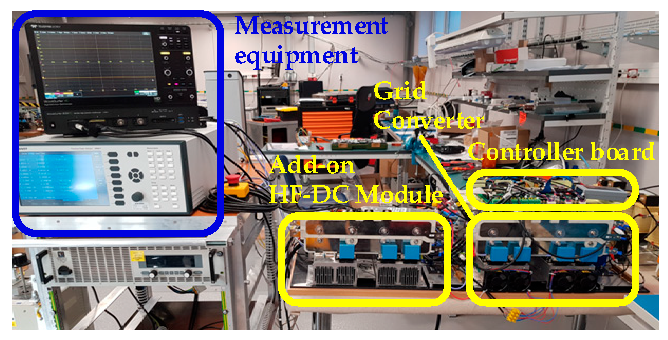 Table 2. The HF transformers were based on nanocrystalline toroids of 160 mm diameter from Vacuumschmelze (Hanau, Germany). The shim inductors were based on ferrite cores with an air gap. Measurements were made using a Teledyne-LeCroy MDA810A oscilloscope (Thousand Oaks, CA, USA) and a ZES Zimmer LMG671 power quality analyzer (Oberursel, Germany).